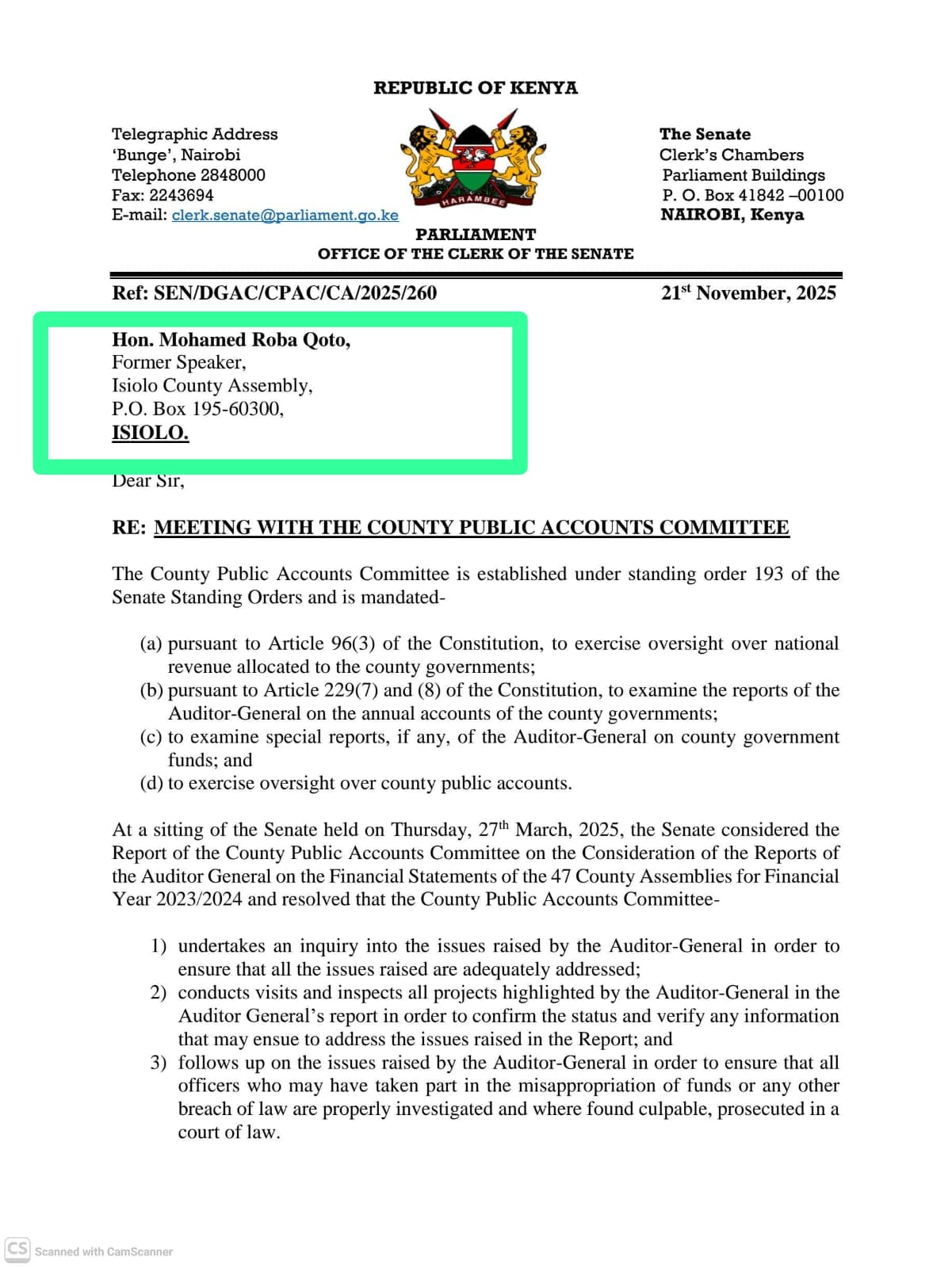 The letter, issued by the Senate Public Accounts Committee (PAC), invites MRQ to appear for questioning – but the deliberate and unambiguous use of the title “former Speaker” has sent shock-waves across Isiolo County, effectively ending months of denial, drama and desperate political theatrics.