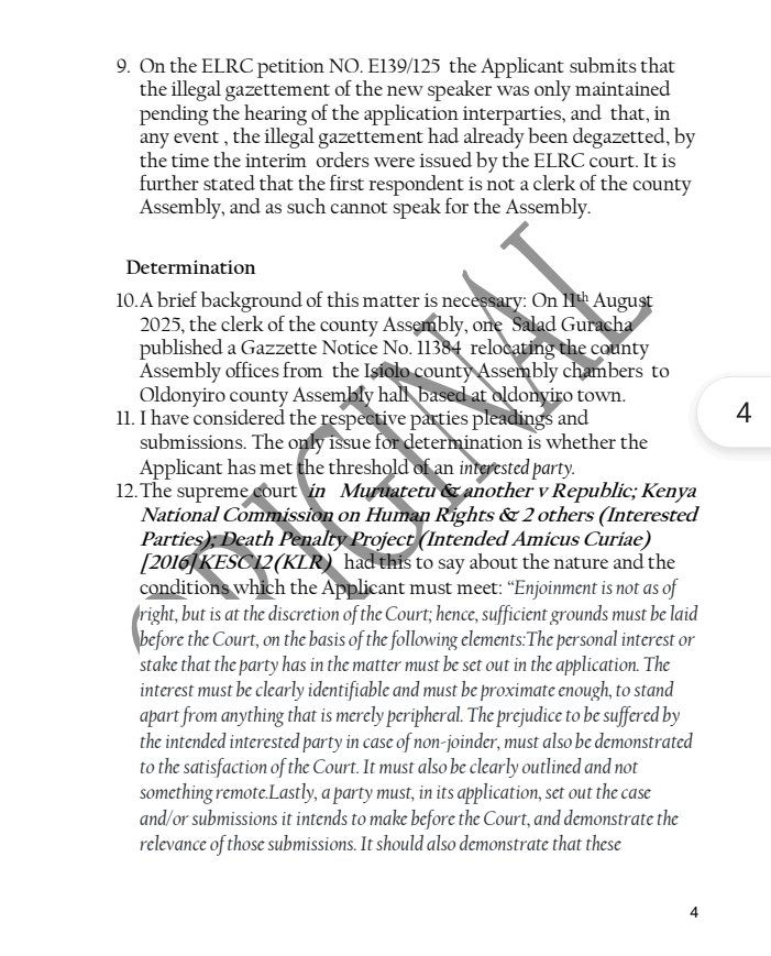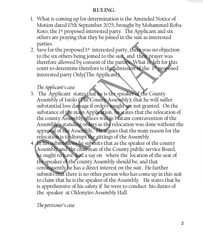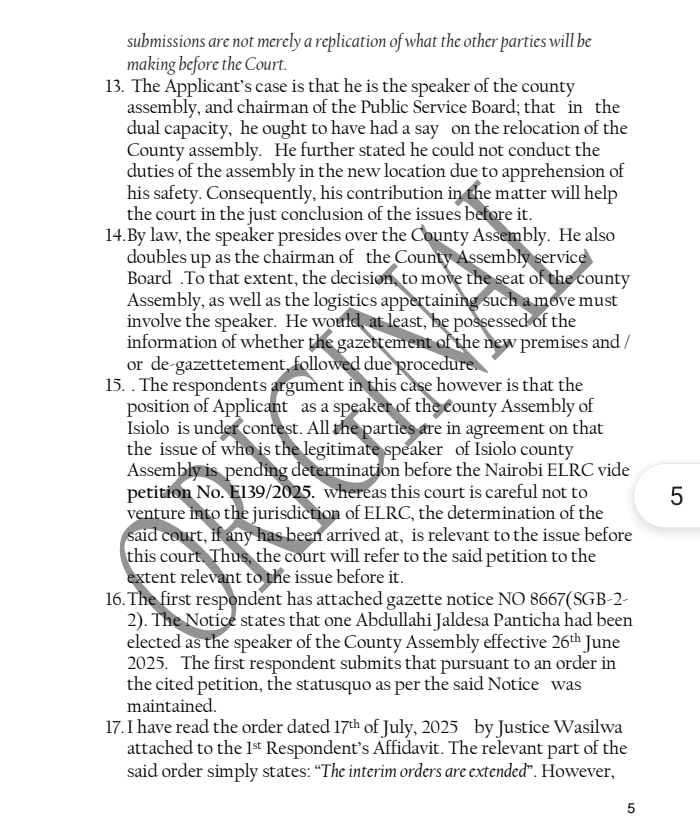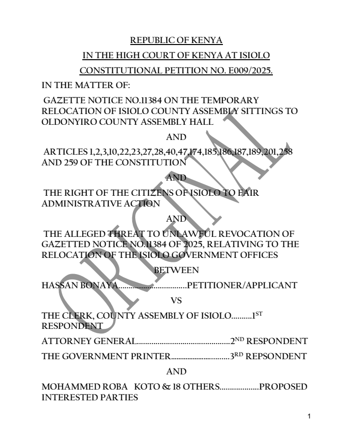 The case centered on Gazette Notice No. 11384, issued on August 25, 2025, which temporarily relocated County Assembly sittings to Oldonyiro amid security concerns and renovations at the main chambers in Isiolo town.