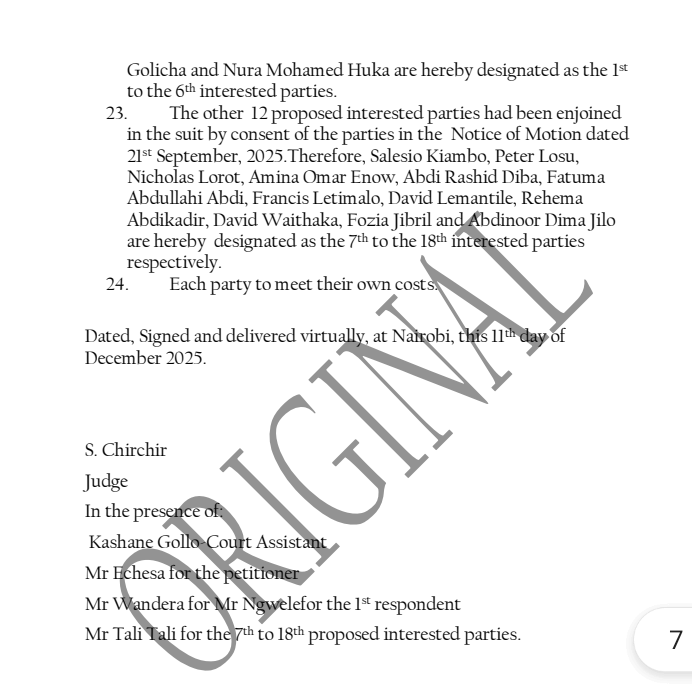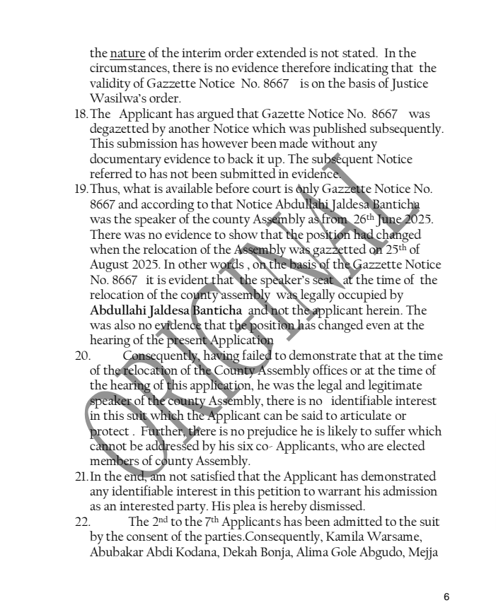 Presiding Judge S. Chirchir dismissed a challenge mounted by former Speaker Mohamed Roba Qoto (MRQ), reinforcing Banticha’s legitimacy and dealing a significant setback to his rival’s claims.