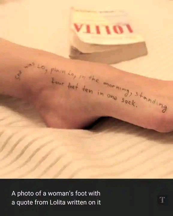 One shot zooms in on a bare foot, scrawled with the line: “It was love at first sight, at last sight, at ever and ever sight.” Another captures thigh-high inscriptions evoking the book’s themes of forbidden desire and manipulation.