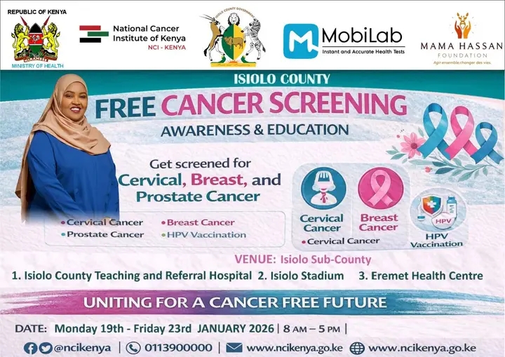 Scheduled to run from Monday, January 19th, to Friday, January 23rd, 2026, the free cancer screening camp will be hosted at the Isiolo County Teaching and Referral Hospital, a central and trusted facility equipped to handle a wide array of medical needs.